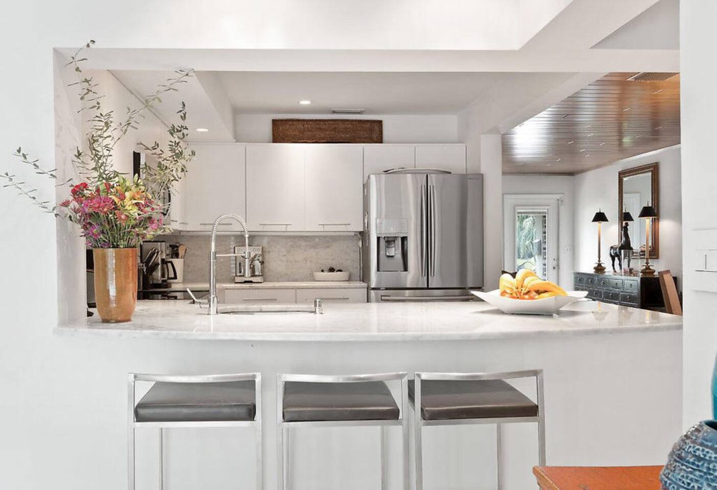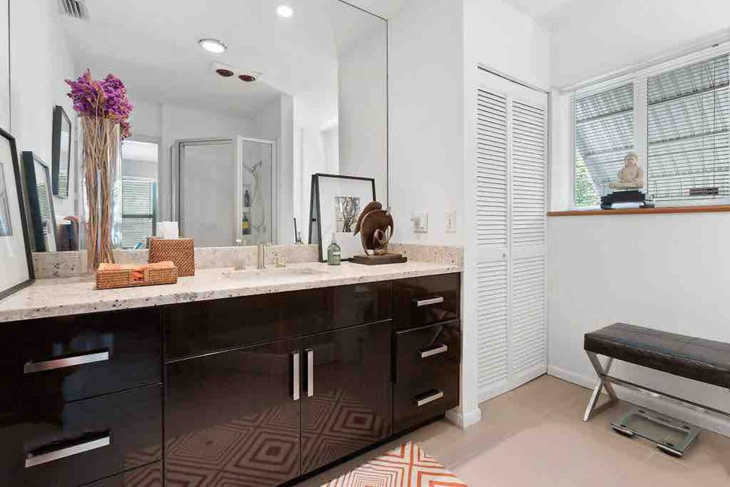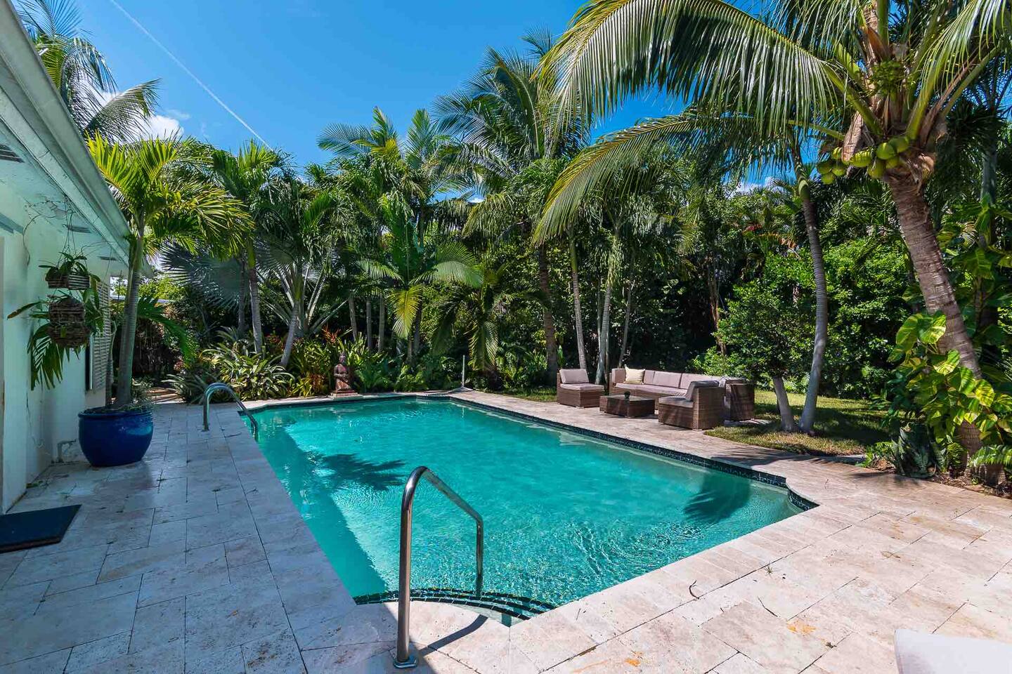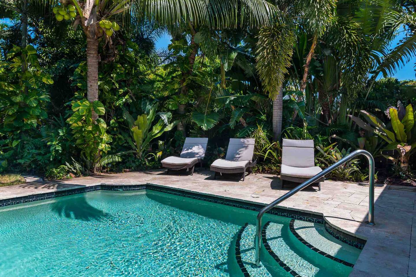Beautiful pool and home. The landscaping is designed to make you feel like you’re in a private jungle oasis. Even though the beach is only a few minutes away you won’t want to leave. There is plenty of seating around the pool and the trees give lots of shade when needed.