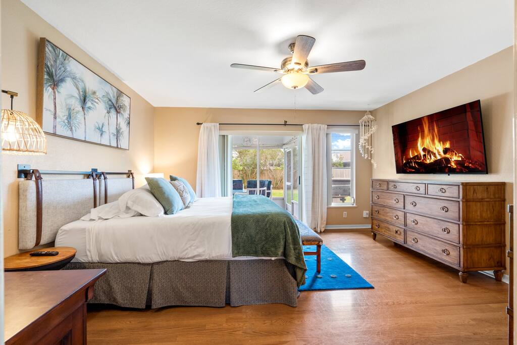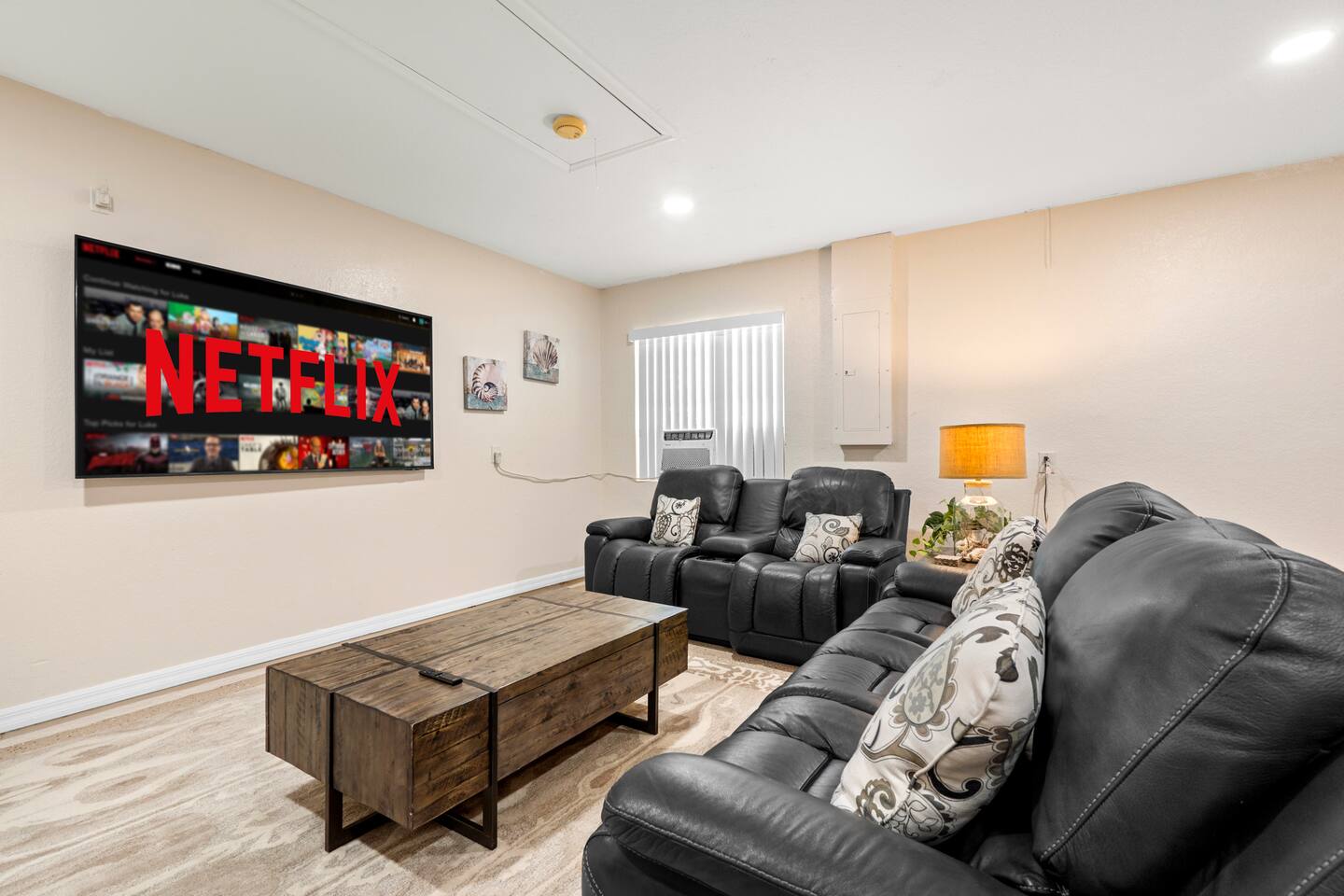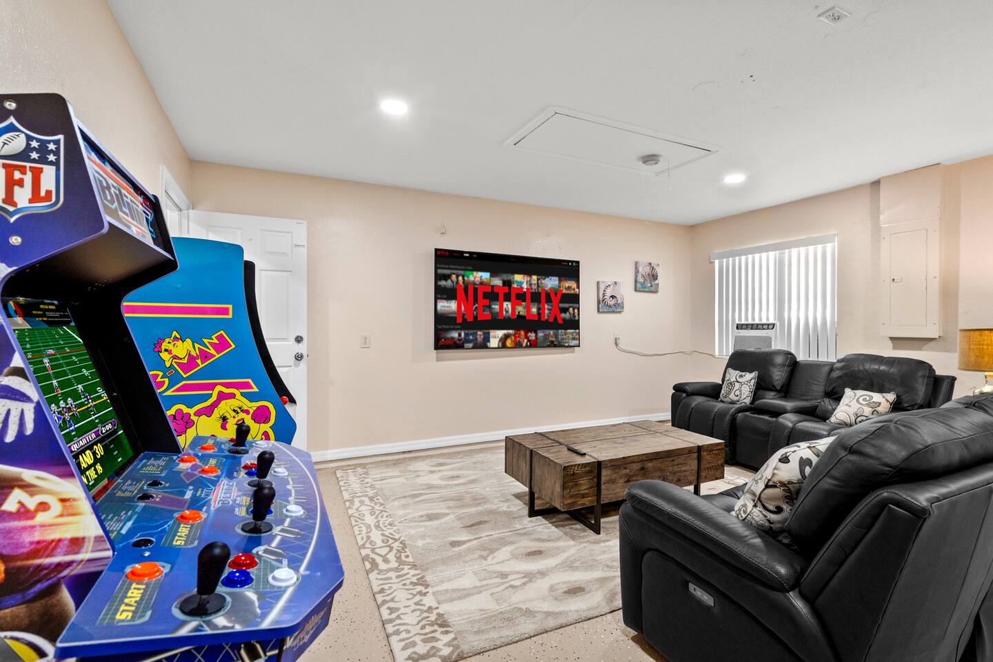 We did our best to make sure the home is set up in a way so you won't want to leave. The general living space is designed with plenty of seating so everyone can be as social as they would like. There are comfy couches and spots to gather in several areas. The bedrooms have large comfy beds, we know a cozy sleep makes the vacation. All bedrooms also have their own smart TV, perfect for some private time. One of the best parts about the inside is the theatre room, equipped with a large projector screen and theatre style seating. Perfect for movie nights or sporting events. No matter where you are spending time on the property you are sure to be making memories.