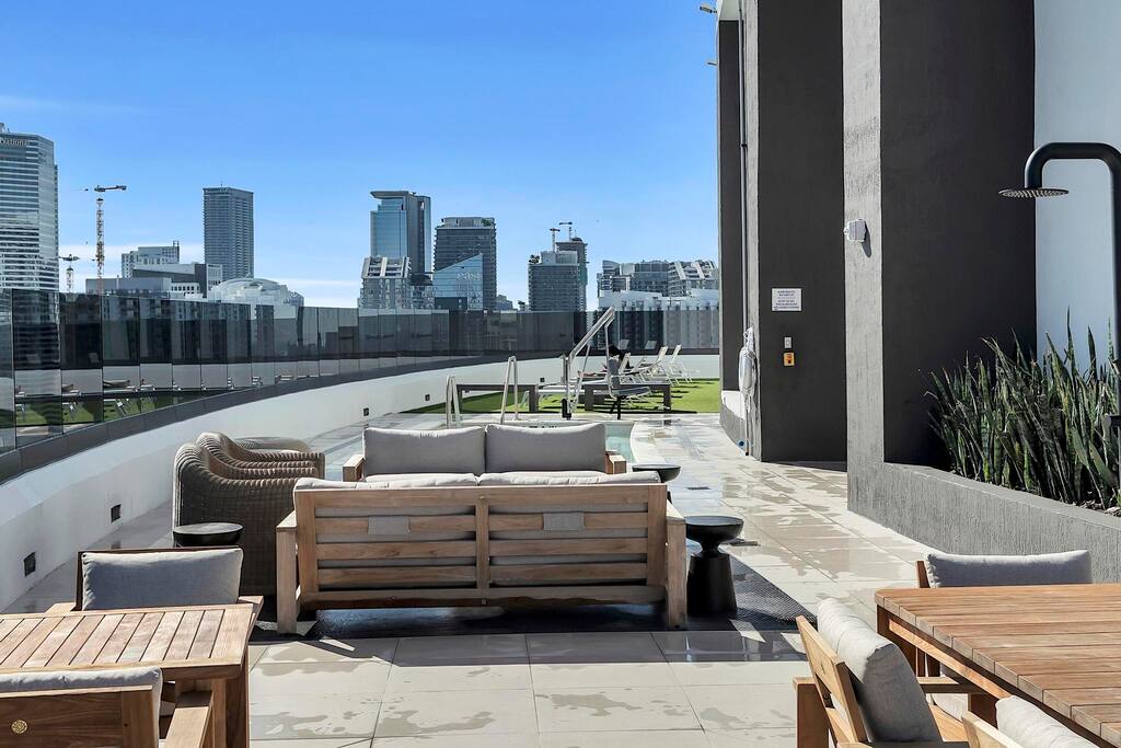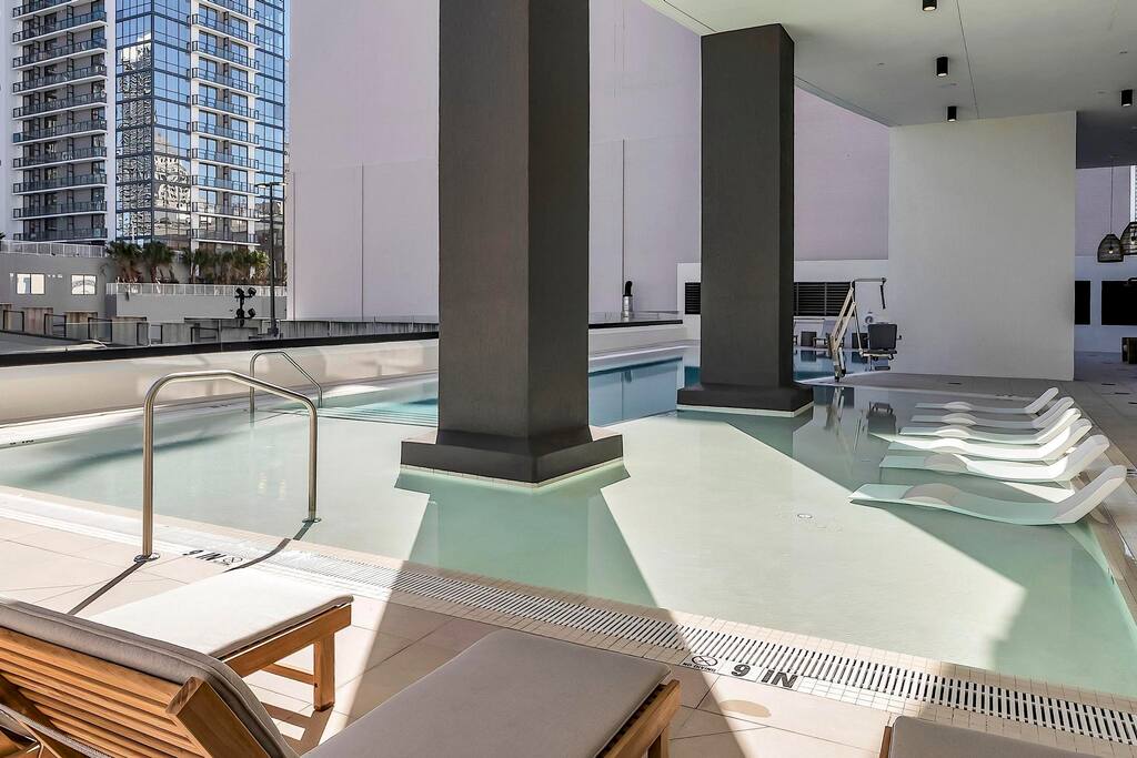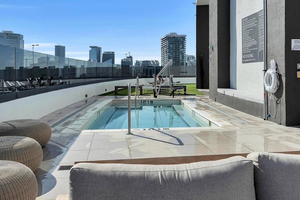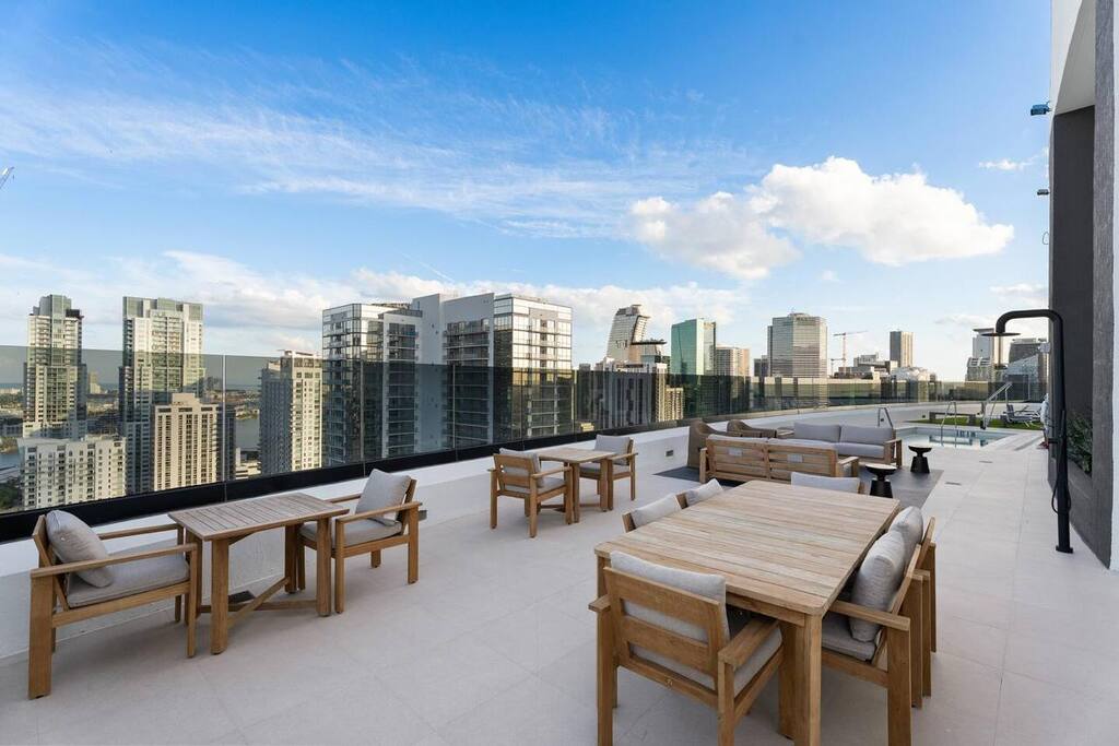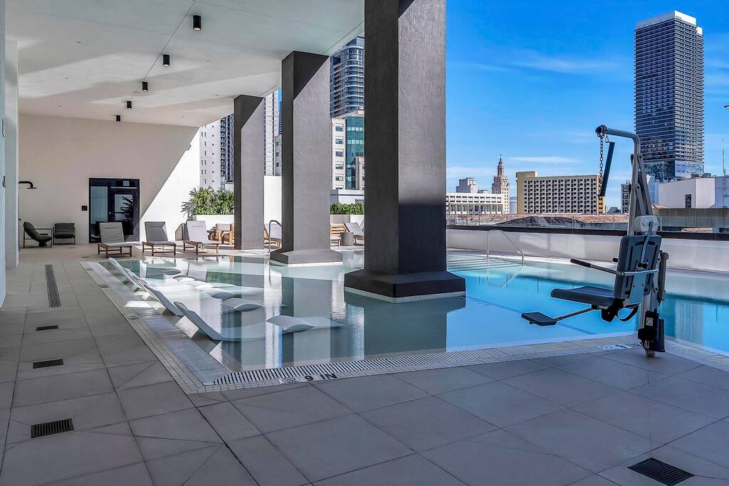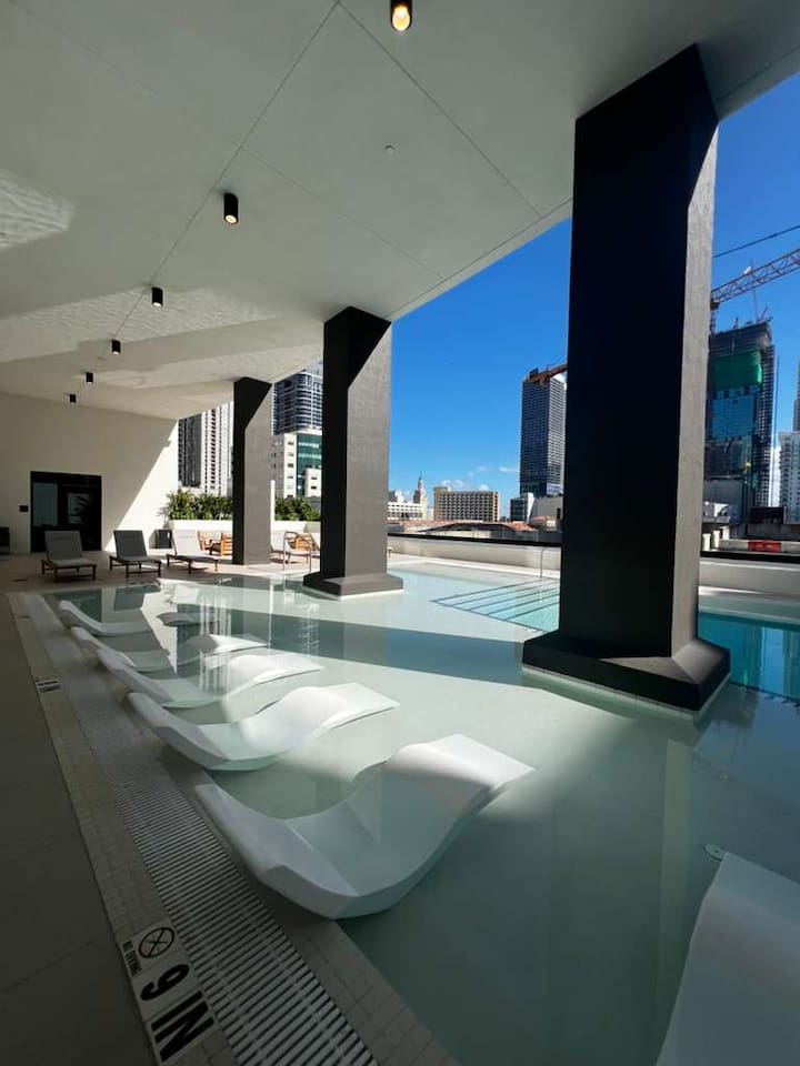 Stylish District 225 Miami, a resort-style high-rise in the heart of Downtown, near great dining and shopping. Enjoy a beautiful pool or roof top hot tub with sea and city views, towel service and grills. Also, co-working spaces, sports simulator, fitness center, basketball and racquetball courts, rock climbing, sauna, and steam rooms. Just 1–2 blocks from the Brightline train station, near Miami Worldcenter, Kaseya Center, Brickell, and the Cruise Port. Ideal for comfort, convenience and style.